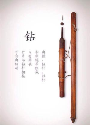 鉆子:是由握、鉆桿、拉桿和牽繩等組成的,內(nèi)有圓孔,竹片與鉆桿相接,可以自由轉(zhuǎn)動(dòng),是用來鉆孔的。常用的鉆子有牽鉆和弓搖鉆兩種,弓搖鉆適用于鉆較大的孔。這兩種鉆子都可以通過更換鉆頭來改變鉆孔大小。