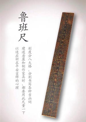 魯班尺:帶有宗教色彩的一種量具,相傳為春秋魯國(guó)公輸班所作,其實(shí)魯班尺的長(zhǎng)短無定,并非通常的衡量長(zhǎng)度??潭确职舜蟾?,每大格又分若干小格,分別書寫各種吉兇詞,內(nèi)容大同小異,規(guī)格亦不統(tǒng)一。建造房屋和制作家具時(shí),從整體到每一部位的高低、寬窄、長(zhǎng)短,都要用此尺量一下,求得與吉利有關(guān)的刻度吻合,避開與災(zāi)兇有關(guān)的刻度,以適應(yīng)祈求平安吉祥的心理。從所標(biāo)文詞的內(nèi)容看,顯然與舊時(shí)的星相學(xué)相聯(lián)系。