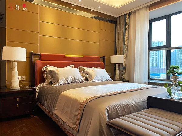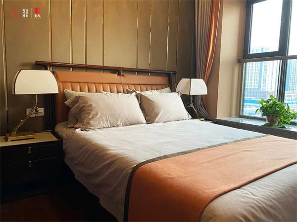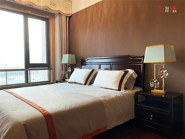 次臥延續(xù)了大宅風(fēng)范的設(shè)計(jì)體系,搭配精致的藝術(shù)點(diǎn)綴,通過藝美裝飾傳遞視覺與感官的雅致體驗(yàn),為生活營造出情誼交融的空間格調(diào)。 主臥次臥風(fēng)格各有千秋,客房以高級暖色調(diào)為主,深色的原木家居與雅致布藝床品交映對比,從點(diǎn)滴細(xì)節(jié)彰顯穩(wěn)重靜謐與奢雅共存的空間藝術(shù)。