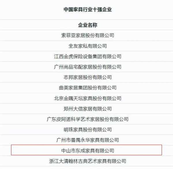 7月20日,由中國輕工業(yè)聯(lián)合會主辦的2023年中國輕工業(yè)百強企業(yè)高峰論壇在北京舉行,論壇發(fā)布了2022年度中國輕工業(yè)二百強企業(yè)、中國輕工業(yè)科技百強企業(yè)及中國家具行業(yè)十強等榮譽榜單。東成紅木憑借在家居領域的研發(fā)創(chuàng)新能力、生產(chǎn)制造能力、市場開拓能力和品牌影響能力,榮獲“中國家具行業(yè)十強企業(yè)”榮譽稱號。