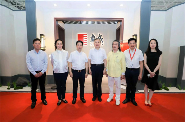 中國家具協(xié)會理事長徐祥楠(中)、中國家具協(xié)會副理事長張冰冰(左二)、中國家具協(xié)會副理事長兼秘書長屠祺(右一)與中國傳統(tǒng)工藝大師、中國家具協(xié)會副理事長、中國家具協(xié)會傳統(tǒng)家具專業(yè)委員會主席團(tuán)執(zhí)行主席、東成紅木董事長張錫復(fù)(左三)及東成紅木研究院院長謝巧明(右二)在展位前合影