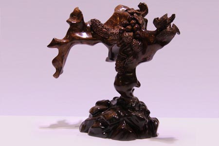 其實(shí),所謂“鬼臉”就是黃花梨木受到傷害之后留下的疤。海南島在每年的8到10月為臺風(fēng)多發(fā)期,風(fēng)向多變且急驟,這段時(shí)間又是黃花梨樹的快速生長期。在此期間,黃花梨樹遭受臺風(fēng)襲擊,主枝被刮斷了,從斷的地方會(huì)長出新芽來,慢慢長成新的主干,原來的主干淪為分支。斷掉的主干處,會(huì)分泌出一種油來把傷口包住,就逐漸長成瘤。如果不能及時(shí)分泌出油來包住傷口,就會(huì)爛成一個(gè)洞。