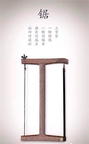鋸子:傳統(tǒng)木工工具之一,用于木材的橫向切斷及縱向分解,手動(dòng)鋸歷史久遠(yuǎn)。條形鋸片又稱“鋸條”,鋸鑿角度一般呈帶傾斜的45°角,鋸牙逐個(gè)相隔向左右岔開,便于鋸條在鋸縫中往復(fù)運(yùn)行。其中框架鋸,鋸條裝于一側(cè),另一側(cè)裝一繩框纏繞絞緊,插竹別子固定,可以調(diào)節(jié)鋸條松緊與角度,十分合理方便。