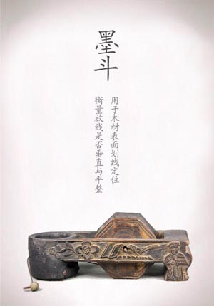 墨斗:傳統(tǒng)的木工常用工具之一,用于木材表面劃線定位。主要結(jié)構(gòu)為一纏繞墨線的線輪和浸有墨汁的墨倉,使用時(shí),將墨線從墨倉中經(jīng)線輪拉出,引于欲加工木材表面,繃直彈拉劃線,用畢裝墨線纏回線輪。古人有“設(shè)規(guī)矩、陳繩墨”之稱。民間墨斗木工自制,墨倉常被雕作桃形、魚形、龍形等,既為自娛,也是木工手藝的一種炫耀。