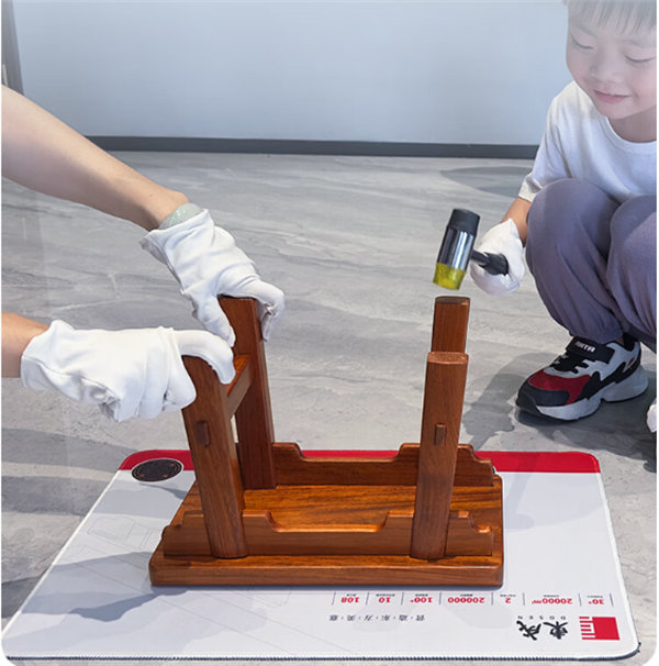 知新小紅凳,既是凳子,也是玩具,更是回憶。讓孩子在生活中娛樂,在娛樂中體驗古人的精湛技藝,提高孩子的想象力、動手力、觀察力。不用釘子和膠水,各個構(gòu)件之間的連接以榫卯相吻合,從而發(fā)現(xiàn)一種看似簡單,卻凝結(jié)著不平凡的中國智慧。