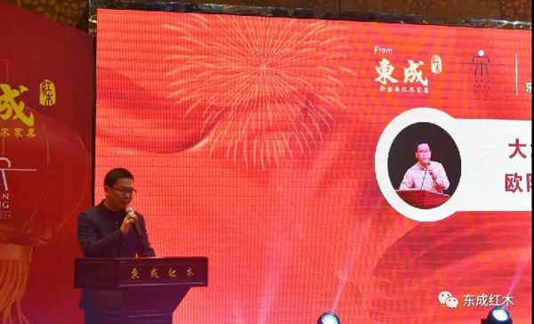 東成紅木營銷副總經(jīng)理曾東陽在會上作2018年度戰(zhàn)略合作發(fā)布會
